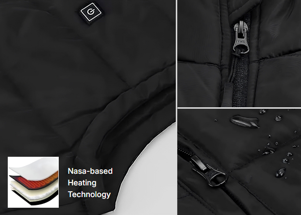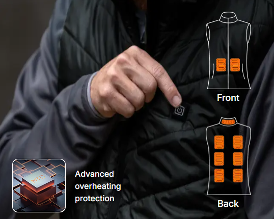 The Solana Gear heated vest features9 specialized heating areasengineered for optimal heat distribution in extreme cold. This lightweight vest keeps users warm without bulky layers, perfect for cold-weather adventures or outdoor activities.